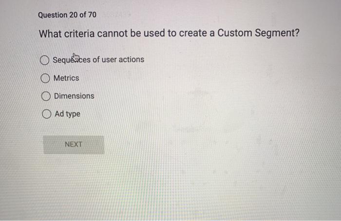 The correct answer is. Sequences of user actions. Which of these criteria CANNOT be used to create a Custom Segment.